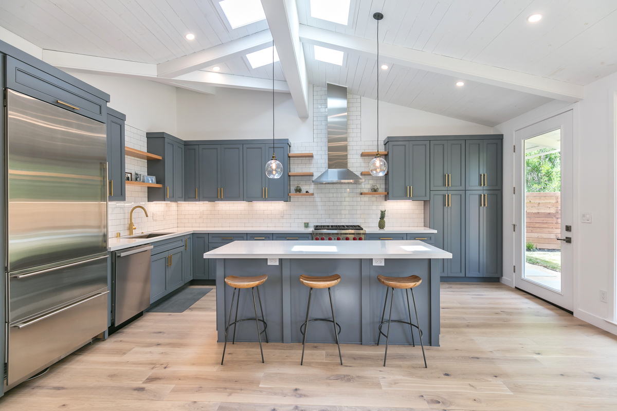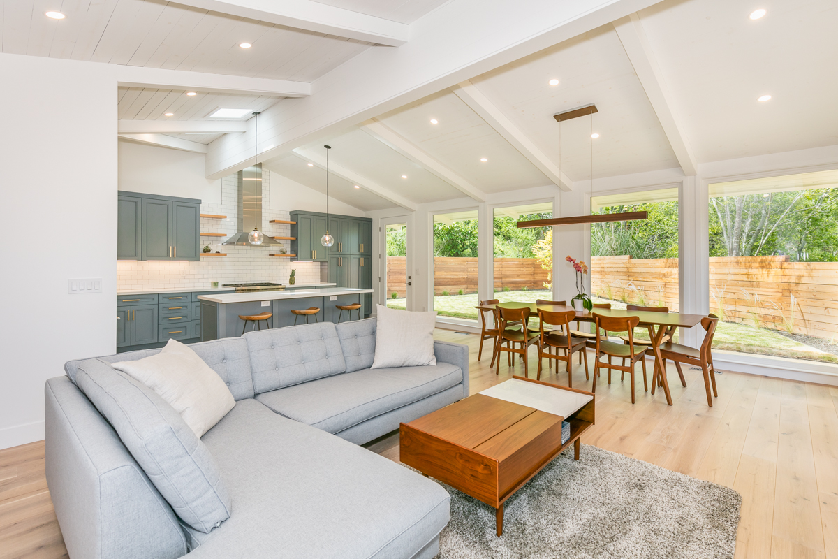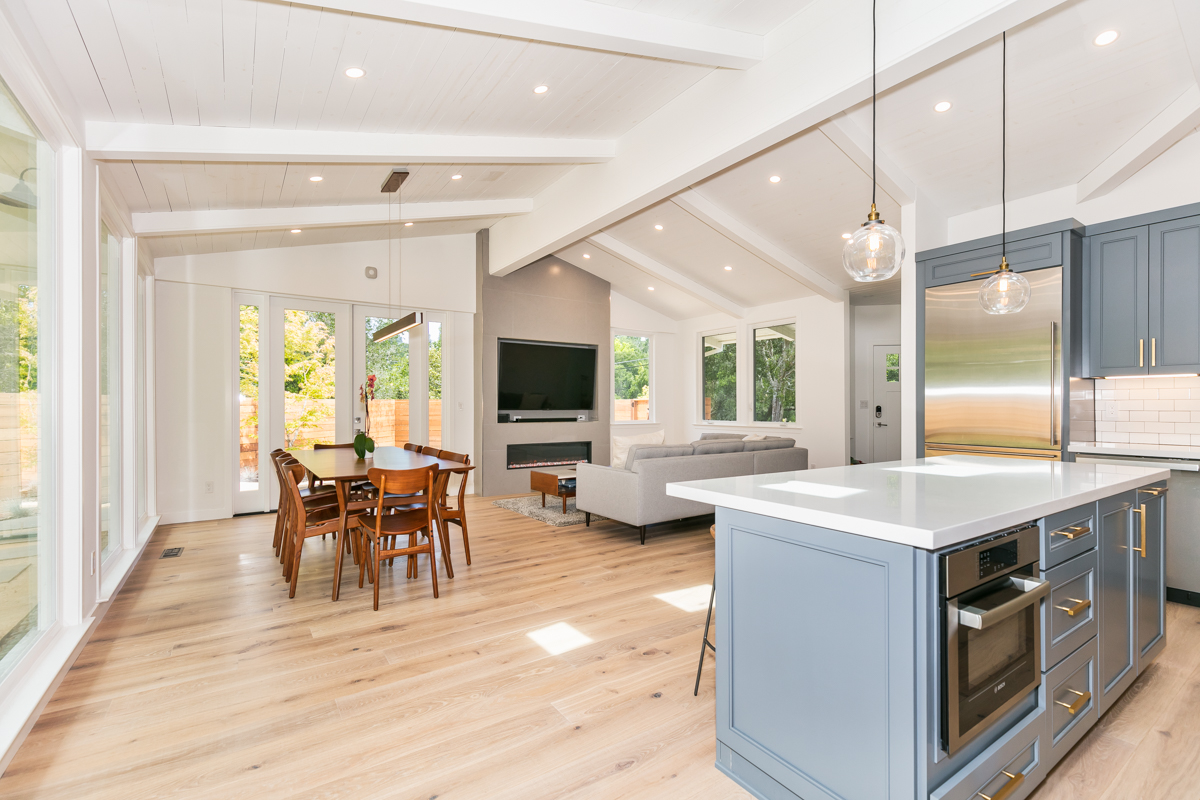 The original home was dark and the kitchen entirely closed off. As part of a whole house remodel we opened up the Kitchen, Living and Dining areas in an open plan and added a gorgeous wall of windows open to the yard creating a light filled, open plan.