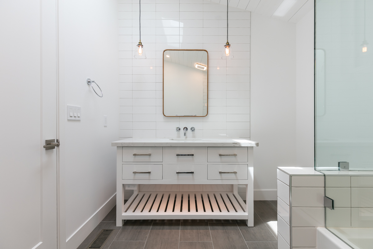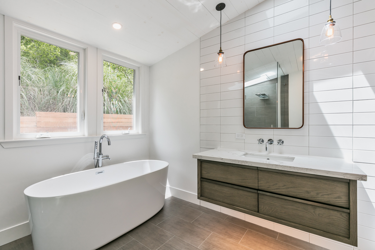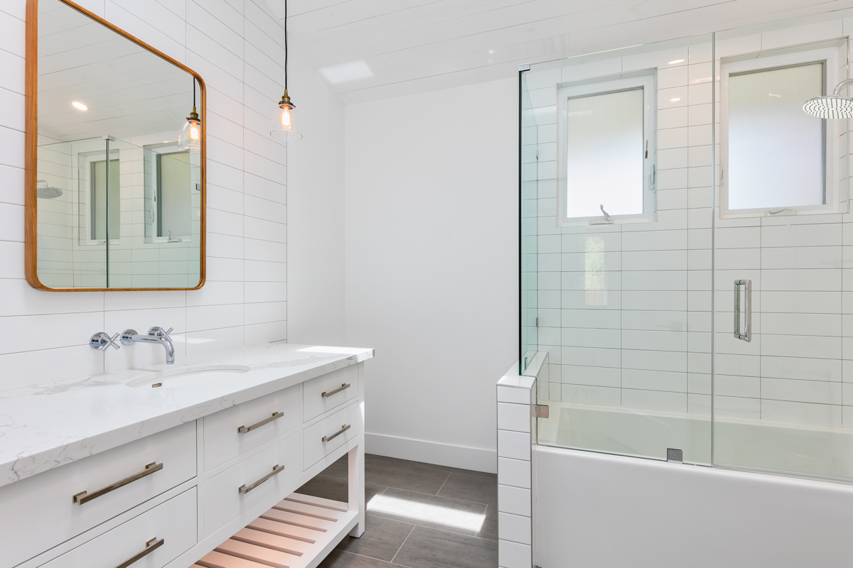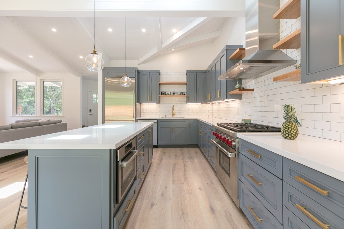 The original home was dark and the kitchen entirely closed off. As part of a whole house remodel we opened up the Kitchen, Living and Dining areas in an open plan and added a gorgeous wall of windows open to the yard creating a light filled, open plan.